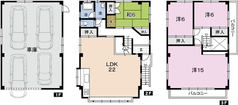 3階)15洋・6洋・6洋 2階)22LDK・6和 1階)駐車場 |